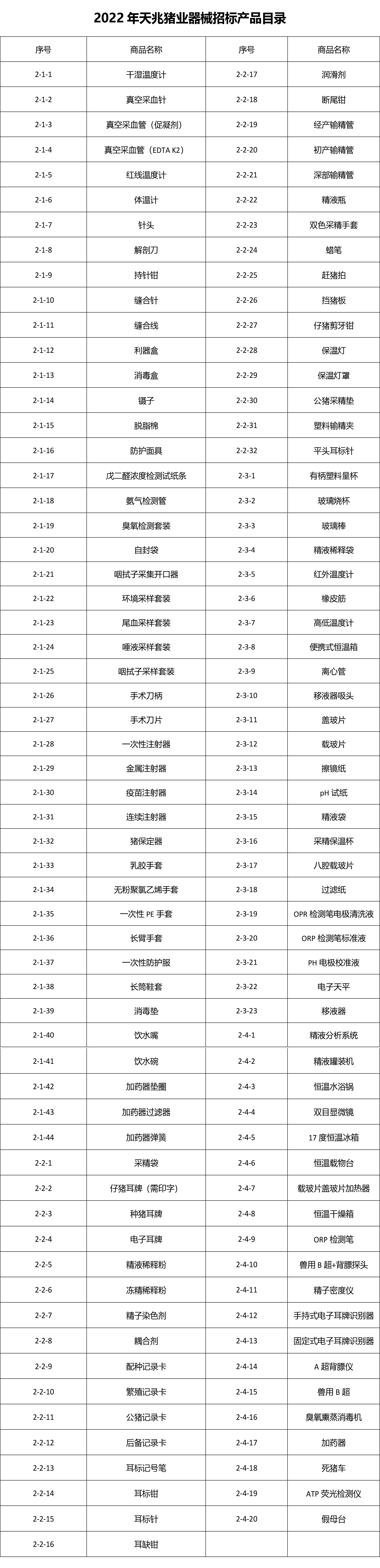 豬場內(nèi)獸醫(yī)、生物安全、生產(chǎn)及育種相關(guān),精液檢測實驗室用器械、耗材、試劑和儀器設(shè)備等。招標產(chǎn)品參見附件《2022年天兆豬業(yè)實器械招標產(chǎn)品目錄》,但不僅限于附表。